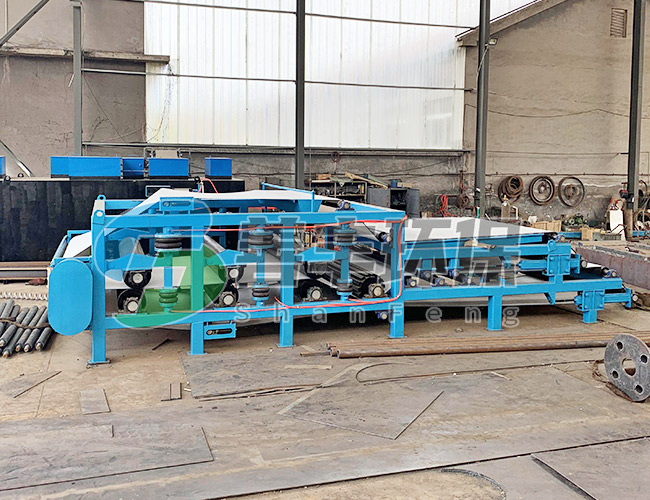紙漿污泥經(jīng)輸送泵進(jìn)入動(dòng)(靜)態(tài)混合器,與同時(shí)加入的濃度為0.05~0.1%陰(陽(yáng))離子絮凝劑溶液相混合并充分反應(yīng)后,渣(泥)漿中的微小固體顆粒(或懸浮物)聚凝成體積較大的絮狀團(tuán)塊,物料間的結(jié)合水及表面水被分離成自由水,當(dāng)物料被輸送鋪展到加長(zhǎng)的重力預(yù)脫水區(qū)(或污泥脫水機(jī)上)的濾網(wǎng)上,在重力的作用下自由水透過(guò)濾網(wǎng)背面而滲出分離,形成不流動(dòng)狀態(tài)的污泥,達(dá)到壓榨脫水區(qū)實(shí)施壓力條件,然后隨著網(wǎng)帶的移動(dòng)而夾持在上下兩條網(wǎng)帶之間,經(jīng)過(guò)具有可調(diào)張緊力的過(guò)濾帶及直徑逐漸遞減的轉(zhuǎn)輥和對(duì)壓輥,實(shí)施連續(xù)增加的緩慢的對(duì)輥擠壓力、剪切力作用,通過(guò)楔形區(qū)、低壓區(qū)、中壓區(qū)、高壓區(qū)和對(duì)輥擠夾區(qū)將渣(泥)漿中的水份經(jīng)過(guò)逐級(jí)增壓的方式不斷擠壓出來(lái),然后形成含水率較低的濾餅排出,通過(guò)刮料板刮離,上下濾帶分開(kāi),經(jīng)過(guò)高壓沖洗水及滾刷清除濾網(wǎng)表面孔隙中的微量顆粒,繼續(xù)進(jìn)入下一步脫水循環(huán)。