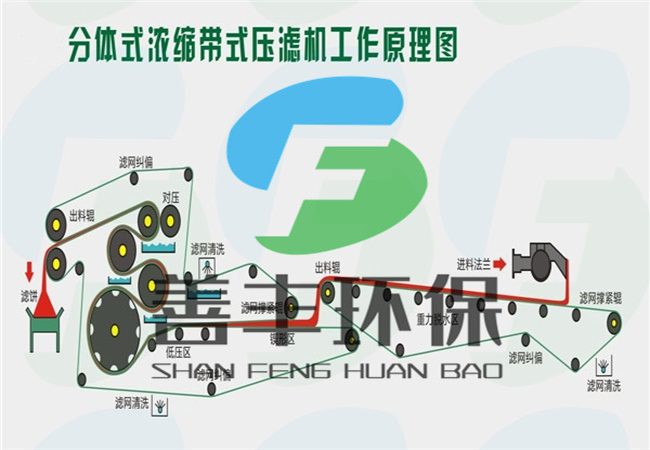 污泥經輸送泵進入動(靜)態混合器,與同時加入的濃度為0.05~0.1%陰(陽)離子絮凝劑溶液相混合并充分反應后,渣(泥)漿中的微小固體顆粒(或懸浮物)聚凝成體積較大的絮狀團塊,物料間的結合水及表面水被分離成自由水,當物料被輸送鋪展到加長的重力預脫水區(或污泥脫水機上)的濾網上,在重力的作用下自由水透過濾網背面而滲出分離,形成不流動狀態的污泥,達到壓榨脫水區實施壓力條件,然后隨著網帶的移動而夾持在上下兩條網帶之間,經過具有可調張緊力的過濾帶及直徑逐漸遞減的轉輥和對壓輥,實施連續增加的緩慢的對輥擠壓力、剪切力作用,通過楔形區、低壓區、中壓區、高壓區和對輥擠夾區將渣(泥)漿中的水份經過逐級增壓的方式不斷擠壓出來,然后形成含水率較低的濾餅排出,通過刮料板刮離,上下濾帶分開,經過高壓沖洗水及滾刷清除濾網表面孔隙中的微量顆粒,繼續進入下一步脫水循環。