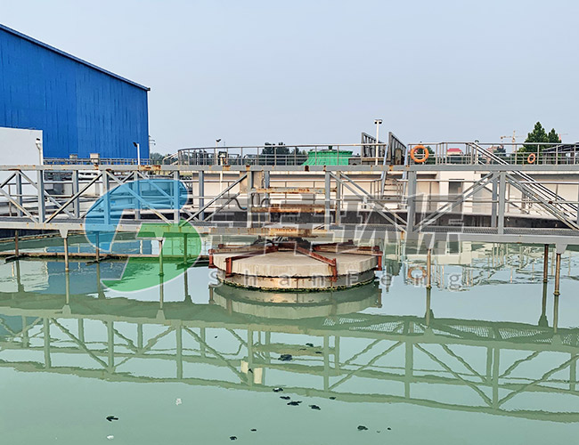 中心傳動驅動機構推動刮泥機構沿中心旋轉,固定于刮臂上的刮板將泥由池邊逐漸刮至池中心的集泥斗中。刮泥板曲線對數螺旋線形,受力均勻,刮泥干凈,當池底遇有障礙時,能自動提耙,保護機器不受傷害,驅動機構可有扭矩保護裝置,工作更加安全。