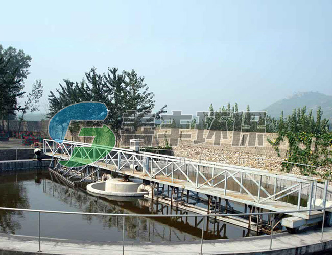 中心傳動驅動機構推動刮泥機構沿中心旋轉,固定于刮臂上的刮板將泥由池邊逐漸刮至池中心的集泥斗中。刮泥板曲線對數(shù)螺旋線形,受力均勻,刮泥干凈,當池底遇有障礙時,能自動提耙,保護機器不受傷害,驅動機構可有扭矩保護裝置,工作更加安全。