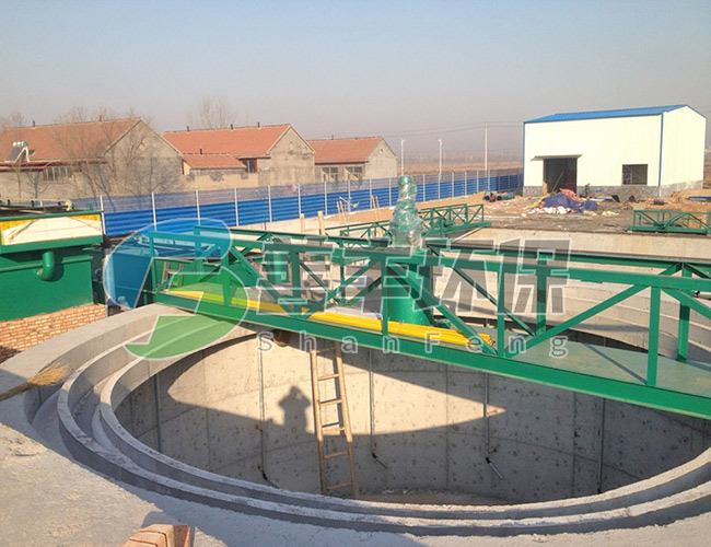 中心傳動(dòng)驅(qū)動(dòng)機(jī)構(gòu)推動(dòng)刮泥機(jī)構(gòu)沿中心旋轉(zhuǎn),固定于刮臂上的刮板將泥由池邊逐漸刮至池中心的集泥斗中。刮泥板曲線對(duì)數(shù)螺旋線形,受力均勻,刮泥干凈,當(dāng)池底遇有障礙時(shí),能自動(dòng)提耙,保護(hù)機(jī)器不受傷害,驅(qū)動(dòng)機(jī)構(gòu)可有扭矩保護(hù)裝置,工作更加安全。