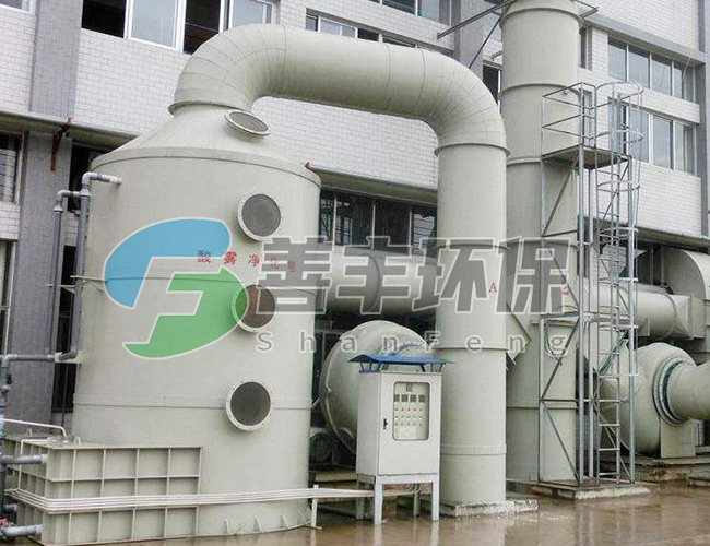 通風(fēng)實驗中需處理的廢氣,由防腐離心風(fēng)機(jī)壓入凈化塔之進(jìn)氣段后,垂直向上與噴淋段自上而下的吸收液起中和反應(yīng),使廢氣濃度降低,然后繼續(xù)向上進(jìn)入填料段,廢氣在塑料球打滾再與吸收液起中和反應(yīng),使廢氣濃度進(jìn)一步降低后進(jìn)入脫水器段,脫去液滴,凈化后的氣體排出大氣。經(jīng)測定分析,硫酸霧凈化率可達(dá)93%,硝酸凈化率可達(dá)90%,鹽酸霧凈化率可達(dá)98%。