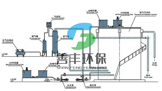 溶氣氣浮污水處理機位鋼制結構,其工作原理是:空氣通過泵送入壓力容器罐,在0.5Mpa壓力下被強制溶解在水中,在突然釋放的情況下,溶解在水中的空氣析出,形成大量致密的微氣泡群,在緩慢上升過程中吸附懸浮物,使懸浮物密度下降而上浮,到達去除SS和CDCcr的目的。該設備氣泡發生量大且致密,直徑更加微小,可達到20微米,吸附力更強,在反應過程中,微氣泡與絮凝體發生強力結合,懸浮物與水的分離瞬間完成,池底污泥可以間歇性排放。運轉表明,處理效果穩定、可靠、達標,操作方便,易于掌握,運行成本低,受到了用戶的廣泛贊譽。