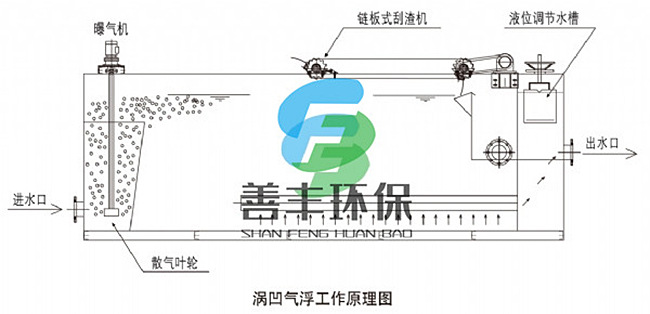 開放的回流管道從曝氣段沿著氣浮槽的底部伸展。在產生微氣泡的同時,渦凹曝氣機會在有回流管的池底形成一個負壓區,這種負壓作用會使廢水從池底回流至曝氣區,然后又返回氣浮段。這個過程確保了40%左右的污水回流及沒有進水的情況下氣浮段仍可進行工作。
