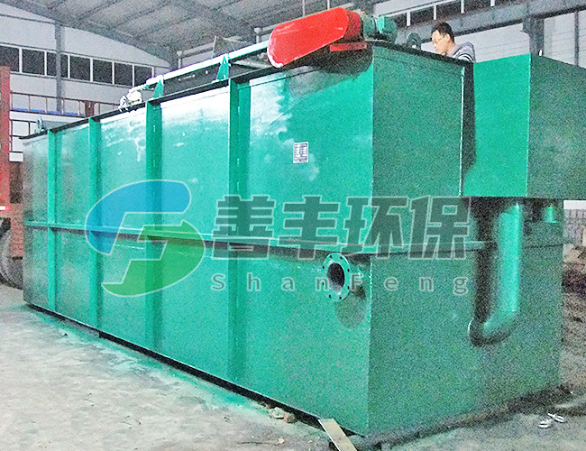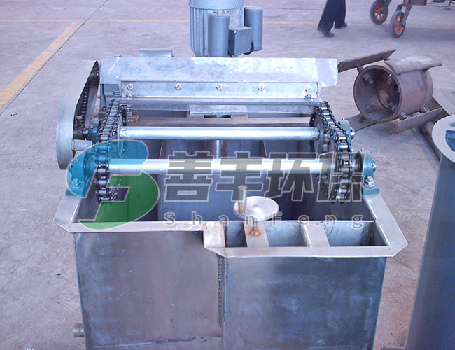 由于氣水混合物和液體之間密度的不平衡,產生了一個垂直向上的浮力,將SS帶到水面。上浮過程中,微氣泡會附著到SS上,到達水面后SS便依靠這些氣泡支撐和維持在水面。浮在水面上的SS間斷地被鏈條刮泥機清除。刮泥機沿著整個液面運動,并將SS從氣浮槽的進口端推到出口端的污泥排放管道中。污泥排放管道里有水平的螺旋推進器,將所收集的污泥送入集泥池中。凈化后的污水流入溢流槽再自流至生化處理部分。
